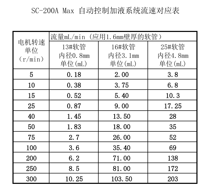 自動控制加液系統流速對應表